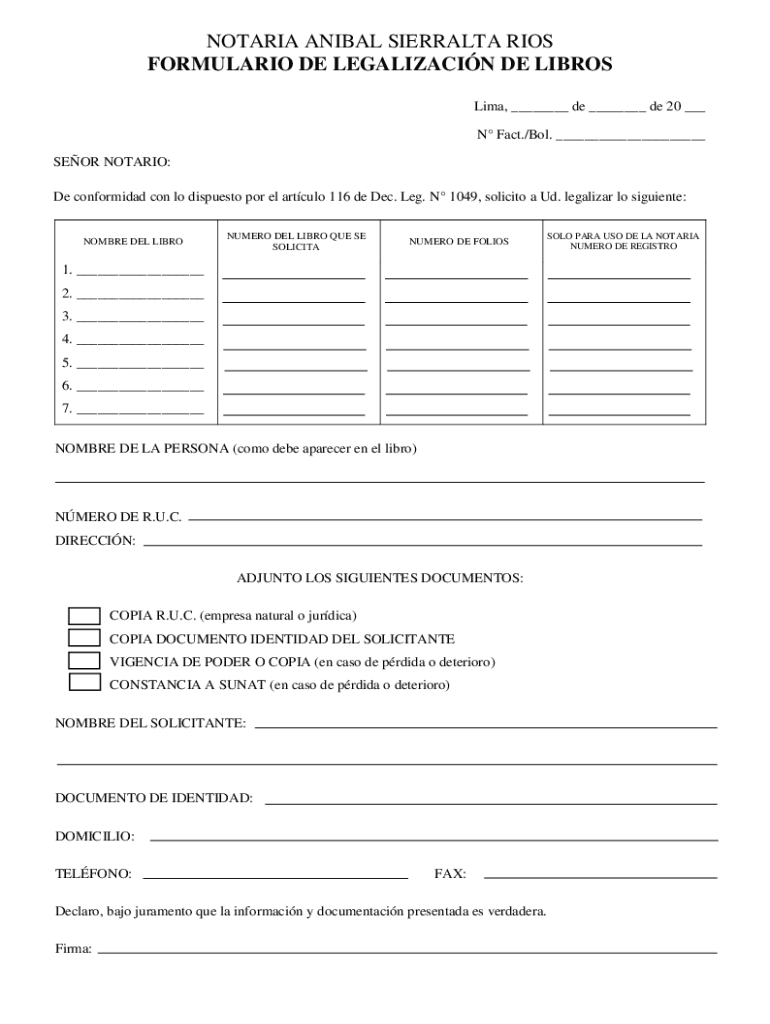 NOTARIAL ANIBAL SIERRA LTA RIOS FORMULA RIO DE LEGALIZATION DE LIBRAS Lima, ___ DE ___ DE 20 ___ N Fact.×Box. ___ SEER ONTARIO: DE conforming con lo dispute POR el Arturo 116 de Dec. Leg. N 1049,