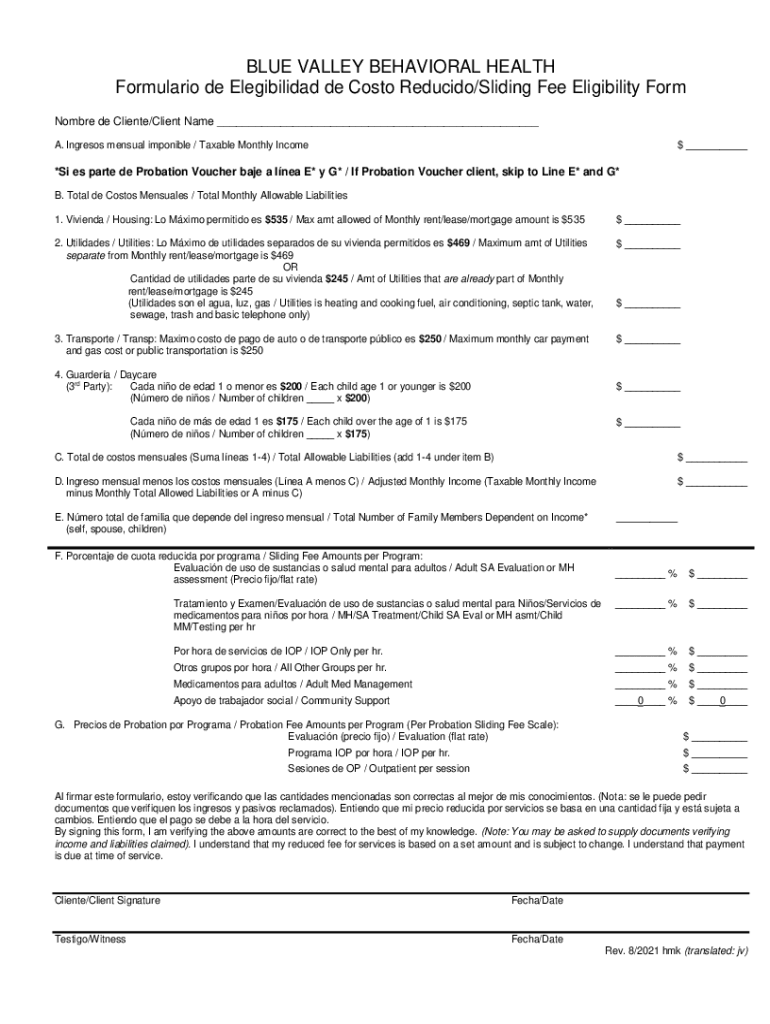 BLUE VALLEY BEHAVIORAL HEALTH Formulation de Elegibilidad de Costo Reduced×Sliding Fee Eligibility Form Hombre de Cliente×Client Name ___ A. Ingress sensual impossible / Taxable Monthly Income ___