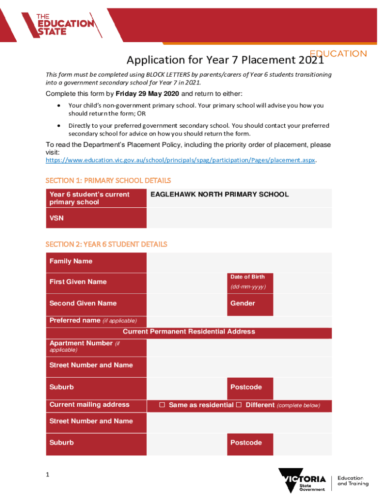 Application for Year 7 Placement 2021 This form must be completed using BLOCK LETTERS by parents×carers of Year 6 students transitioning into a government secondary school for Year 7 in 2021. Complete