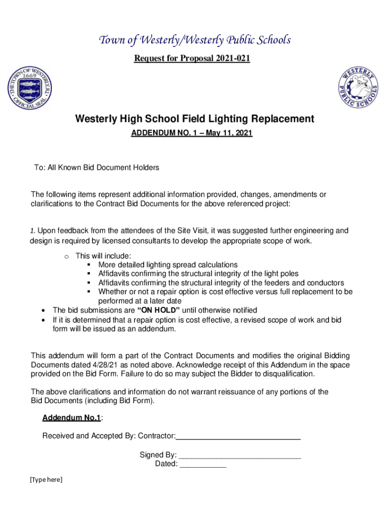 Town of Westerly×Westerly Public Schools Request for Proposal 2021021Westerly High School Field Lighting Replacement ADDENDUM NO. 1 May 11, 2021To: All Known Bid Document Holders following items