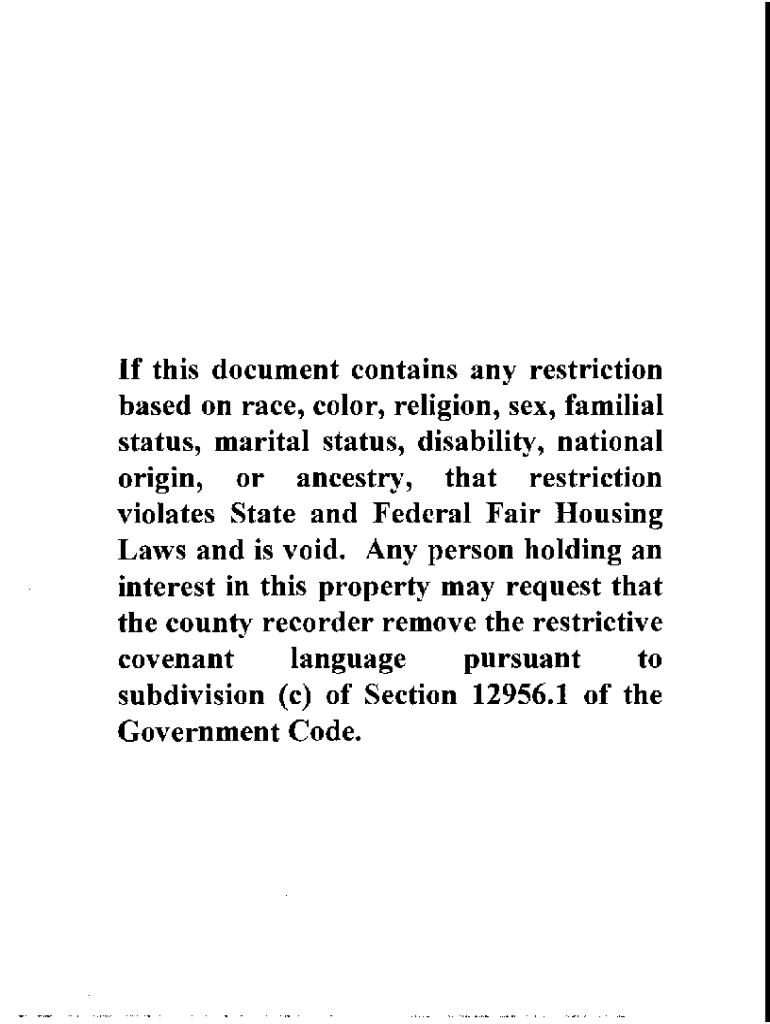 If this document contains any restriction based on race, color, religion, sex, familial status, marital status, disability, national origin, or ancestry, that restriction violates State and Federal