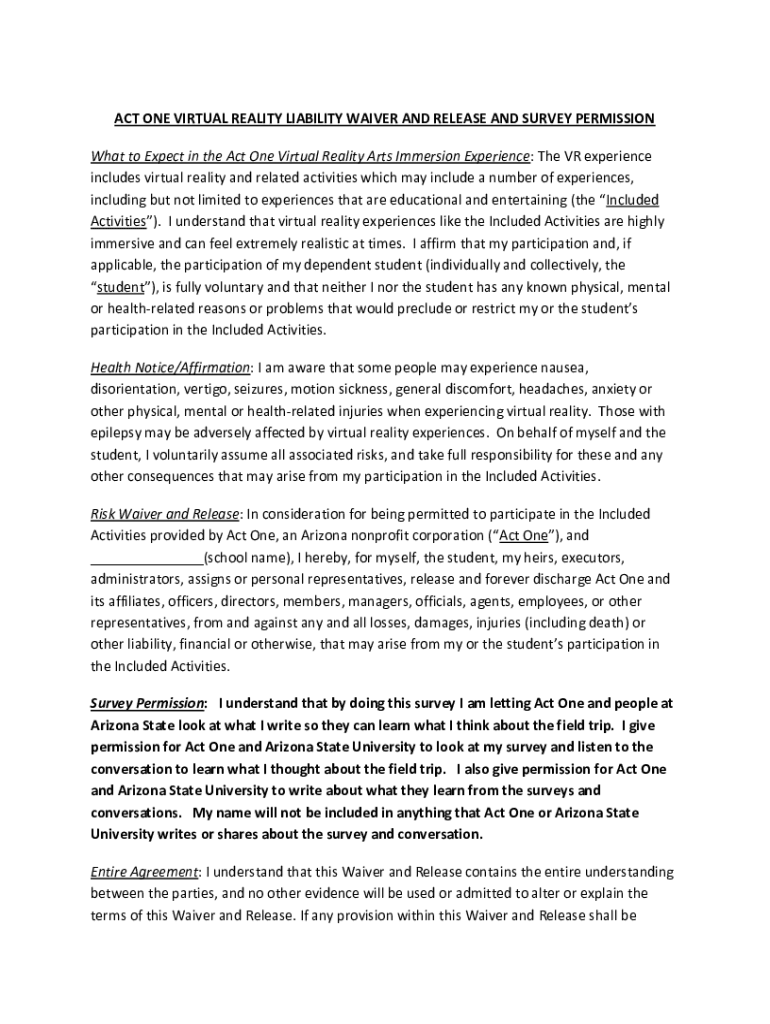 ACT ONE VIRTUAL REALITY LIABILITY WAIVER AND RELEASE AND SURVEY PERMISSION What to Expect in the Act One Virtual Reality Arts Immersion Experience: The VR experience includes virtual reality and related