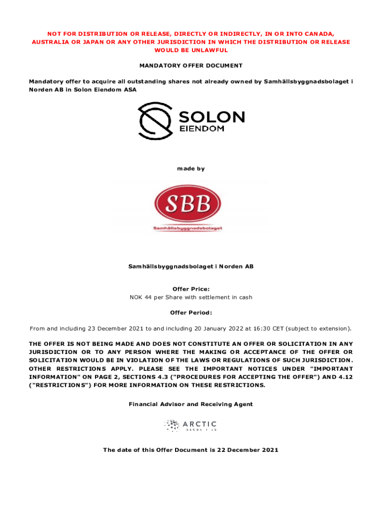 NOT FOR DISTRIBUTION OR RELEASE, DIRECTLY OR INDIRECTLY, IN OR INTO CANADA, AUSTRALIA OR JAPAN OR ANY OTHER JURISDICTION IN WHICH THE DISTRIBUTION OR RELEASE WOULD BE UNLAWFUL MANDATORY OFFER DOCUMENT