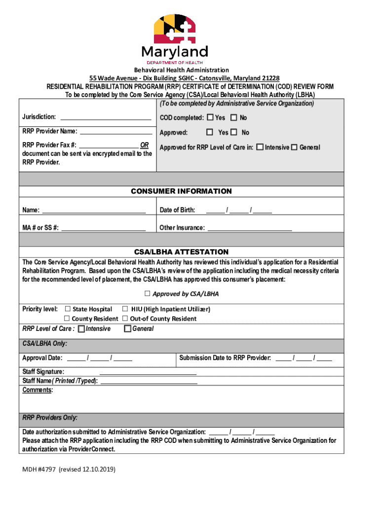 Behavioral Health Administration 55 Wade Avenue Dix Building SGC Catonsville, Maryland 21228 RESIDENTIAL REHABILITATION PROGRAM (RAP) CERTIFICATE of DETERMINATION (COD) REVIEW FORM To be completed