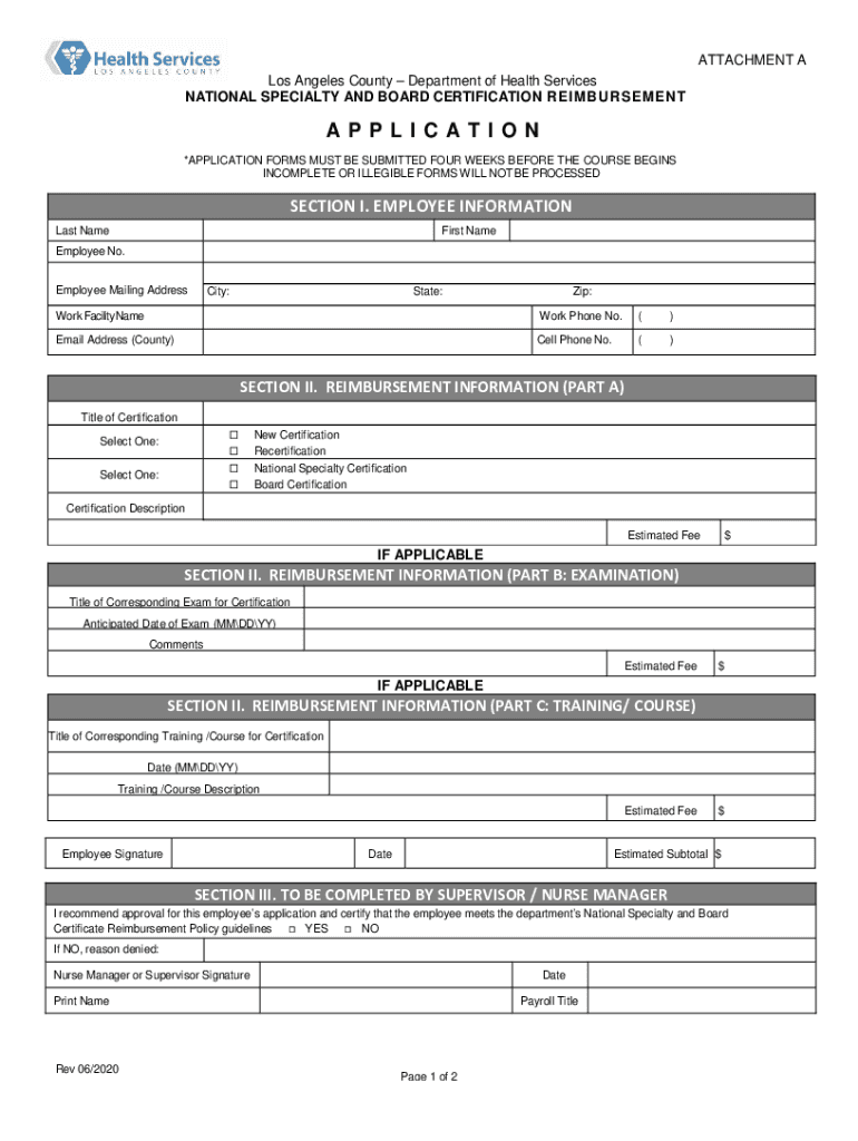 ATTACHMENT A Los Angeles County Department of Health Services NATIONAL SPECIALTY AND BOARD CERTIFICATION RIM BUR SEM ENTRAP P LI C AT I O N *APPLICATION FORMS MUST BE SUBMITTED FOUR WEEKS BEFORE THE