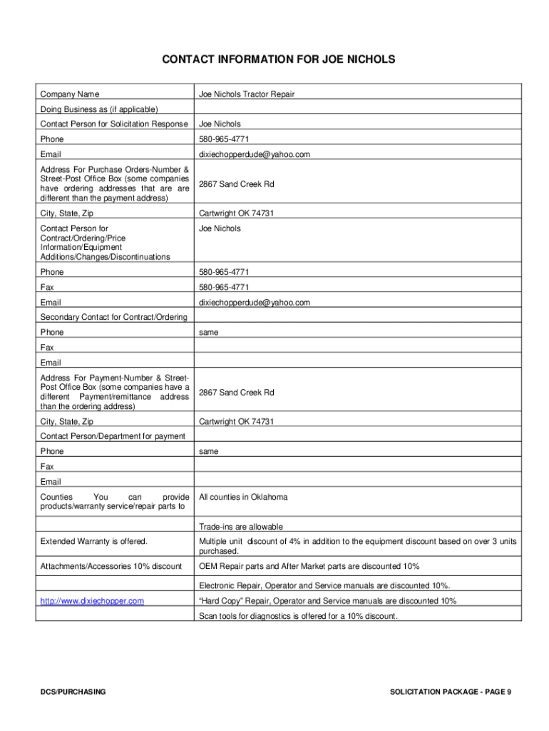 CONTACT INFORMATION FOR JOE NICHOLS Company Name Joe Nichols Tractor Repairing Business as (if applicable) Contact Person for Solicitation Response Joe NicholsPhone5809654771Emaildixiechopperdude×yahoo.address