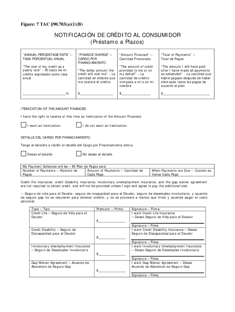 Figure: 7 TAC 90.703×a)(1)(B×NOTIFICATION DE CREDIT AL CONSIDER (Protein a Plazas) ANNUAL PERCENTAGE RATE TASK PERCEPTUAL ANNUAL The cost of my credit as a yearly rate El cost ode me credit expressed