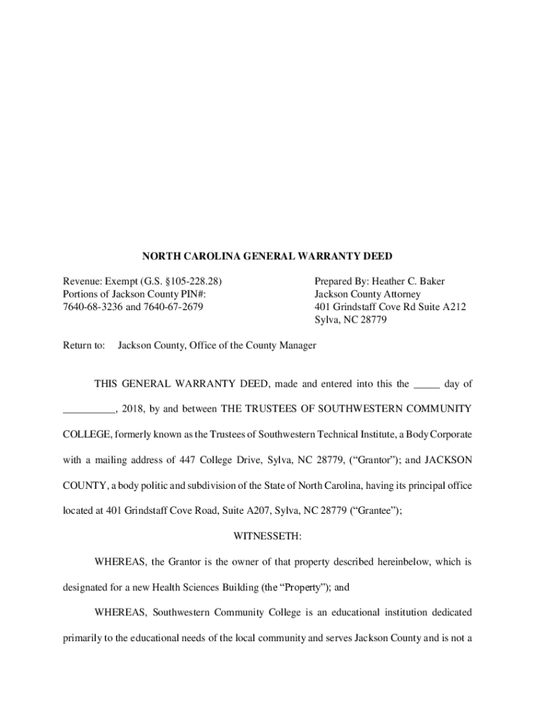NORTH CAROLINA GENERAL WARRANTY DEED Revenue: Exempt (G.S. 105228.28) Portions of Jackson County PIN#: 7640683236 and 7640672679Return to:Prepared By: Heather C. Baker Jackson County Attorney 401