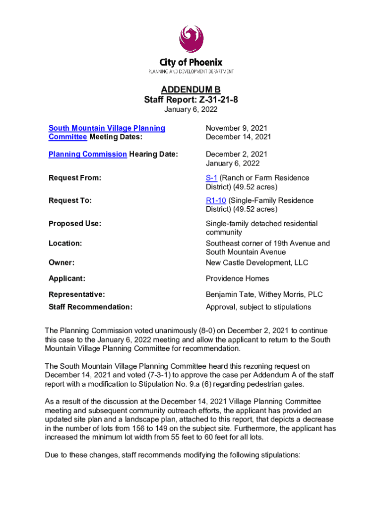 ADDENDUM B Staff Report: Z31218 January 6, 2022South Mountain Village Planning Committee Meeting Dates:November 9, 2021, December 14, 2021Planning Commission Hearing Date:December 2, 2021, January