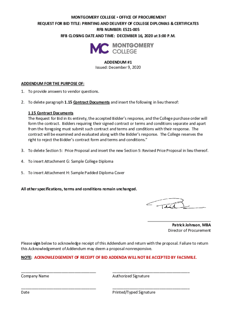 MONTGOMERY COLLEGE OFFICE OF PROCUREMENT REQUEST FOR BID TITLE: PRINTING AND DELIVERY OF COLLEGE DIPLOMAS & CERTIFICATES ROB NUMBER: E521005 ROB CLOSING DATE AND TIME: DECEMBER 16, 2020, at 3:00 P.M.ADDENDUM
