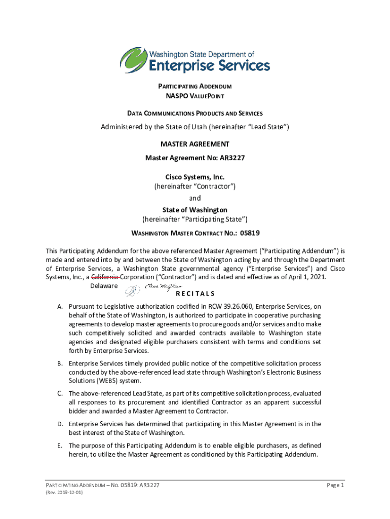 PARTICIPATING ADDENDUM NAS PO BLUEPOINT DATA COMMUNICATIONS PRODUCTS AND SERVICES Administered by the State of Utah (hereinafter Lead State) MASTER AGREEMENT No: AR3227 Cisco Systems, Inc. (hereinafter