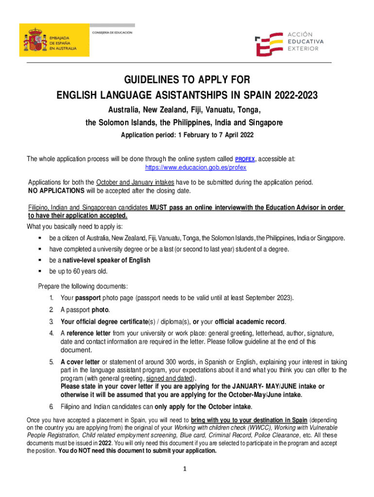 GUIDELINES TO APPLY FOR ENGLISH LANGUAGE ASISTANTSHIPS IN SPAIN 20222023 Australia, New Zealand, Fiji, Vanuatu, Tonga, the Solomon Islands, the Philippines, India and Singapore Application period: