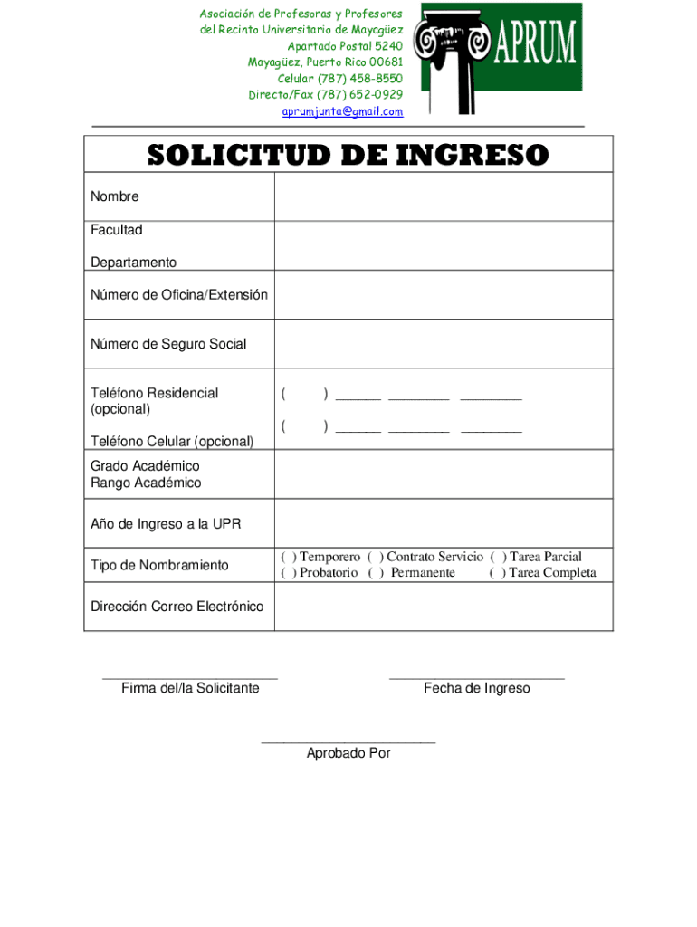 Association de Profesoras y Professors Del Races into Universitario de Mayagez Apart ado Postal 5240 Mayaguez, Puerto Rico 00681 Cellular (787× 4588550 Direct×Fax (787× 6520929 aprumjunta×Gmail.comSOLICITUD