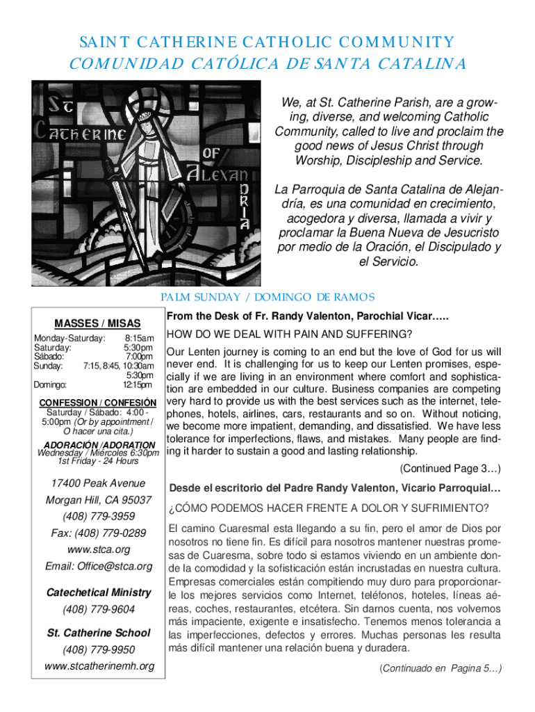 SAINT CATHERINE CATHOLIC COMMUNITYCOMUNIDAD CATALINA DE SANTA CATALINA We, at St. Catherine Parish, are a growing, diverse, and welcoming Catholic Community, called to live and proclaim the good news