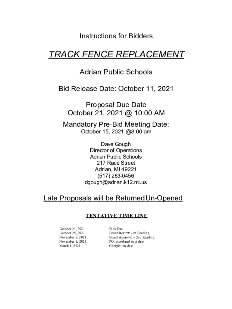 Instructions for BiddersTRACK FENCE REPLACEMENT Adrian Public Schools Bid Release Date: October 11, 2021, Proposal Due Date October 21, 2021 × 10:00 AM Mandatory PreBid Meeting Date: October 15,