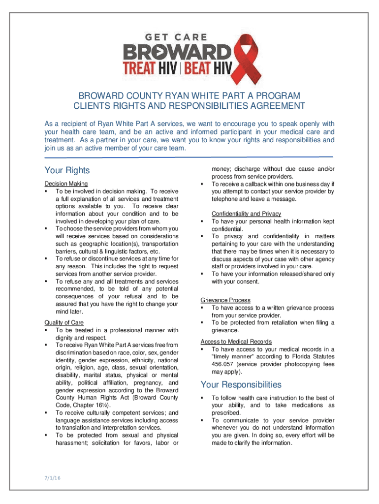 BROWARD COUNTY RYAN WHITE PART A PROGRAM CLIENTS RIGHTS AND RESPONSIBILITIES AGREEMENT As a recipient of Ryan White Part A services, we want to encourage you to speak openly with your health care