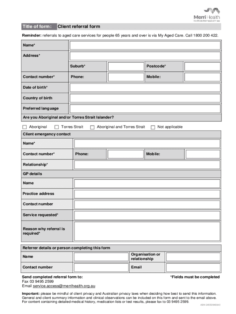 Title of form:Client referral formReminder: referrals to aged care services for people 65 years and over is via My Aged Care. Call 1800 200 422. Name* Address* Suburb×Postcode×Phone:Mobile:Contact