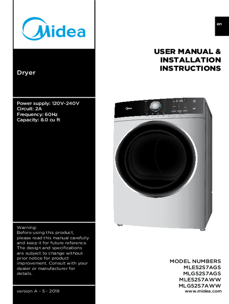 EnDryerUSER MANUAL & INSTALLATION INSTRUCTIONSPower supply: 120V240V Circuit: 2A Frequency: 60Hz Capacity: 8.0 cu warning: Before using this product, please read this manual carefully and keep it