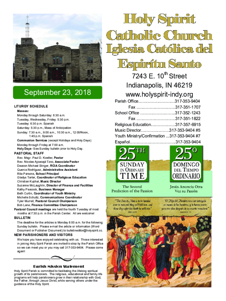 September 23, 2018, LITURGY SCHEDULE Masses: Monday through Saturday: 8:30 a.m. Tuesday, Wednesday, Friday: 5:30 p.m. Tuesday: 6:30 p.m. Spanish Saturday: 5:30 p.m., Mass of Anticipation Sunday: 7:30