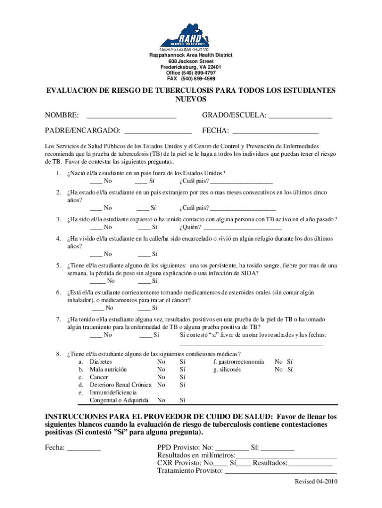 Rappahannock Area Health District 608 Jackson Street Fredericksburg, VA 22401 Office (540× 8994797 FAX (540) 8994599EVALUACION DE DIEGO DE TUBERCULOSIS PARA To-dos LOS ESTUDIANTES NEVIS HOMBRE:___PADRE×ENLARGED: