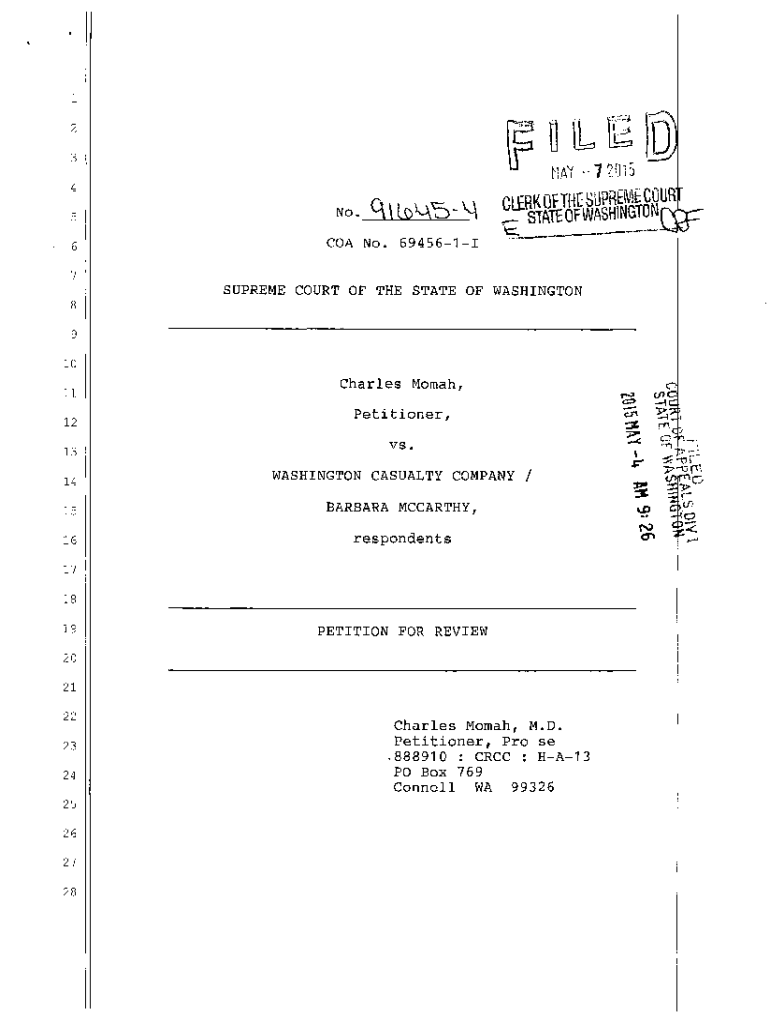 1 23 45 6No. C LOA 2×E1fgu,R×COA No. 694561It::::.7SUPREME COURT OF THE STATE OF WASHINGTON 8 910 11 1213Charles Mom ah, *'C5 Petitioner, vs.c.f:s 14WASHINGTON CASUALTY COMPANY /15BARBARA McCarthy,16respondents1718