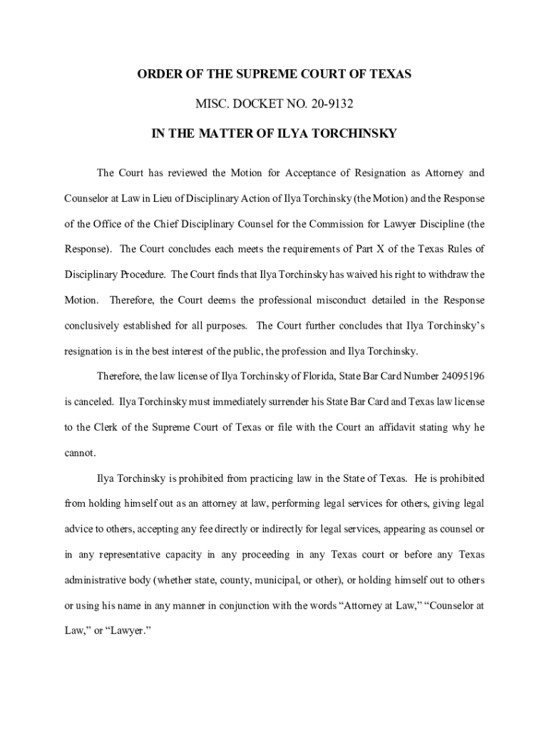 ORDER OF THE SUPREME COURT OF TEXAS MISC. DOCKET NO. 209132 IN THE MATTER OF ILYA TORCHING The Court has reviewed the Motion for Acceptance of Resignation as Attorney and Counselor at Law in Lieu