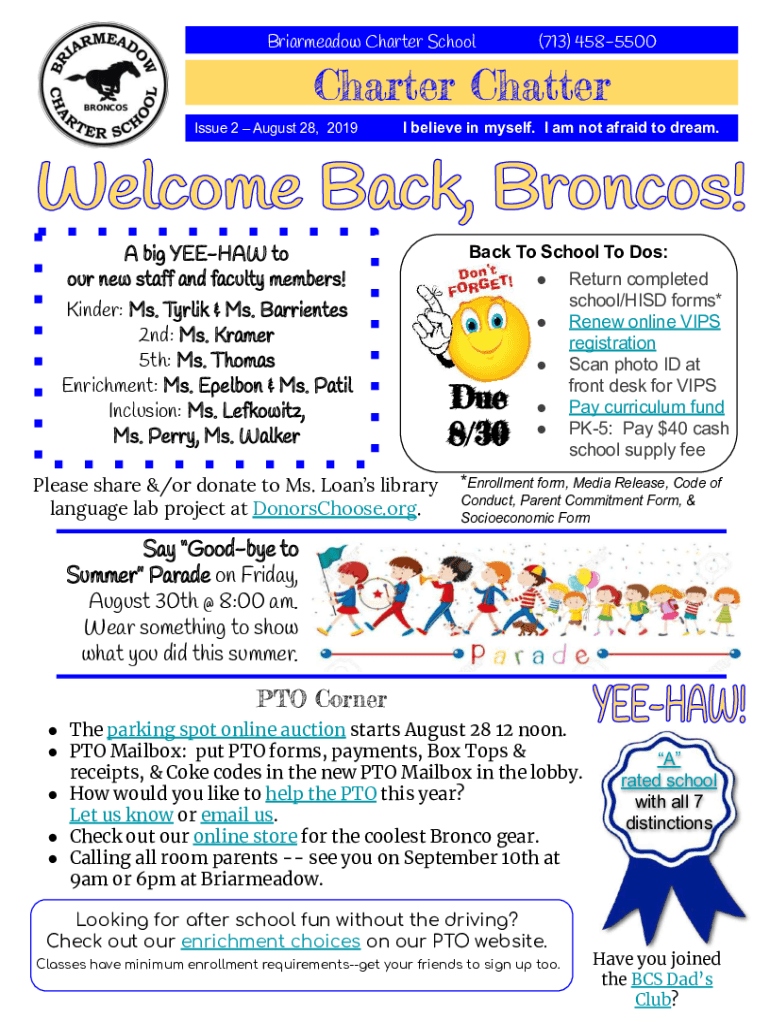 Briarmeadow Charter School×713) 4585500Charter Chatter big HEEHAW to our new staff and faculty members! Kinder: Ms. Track & Ms. Barrettes 2nd: Ms. Kramer 5th: Ms. Thomas Enrichment: Ms. Person &