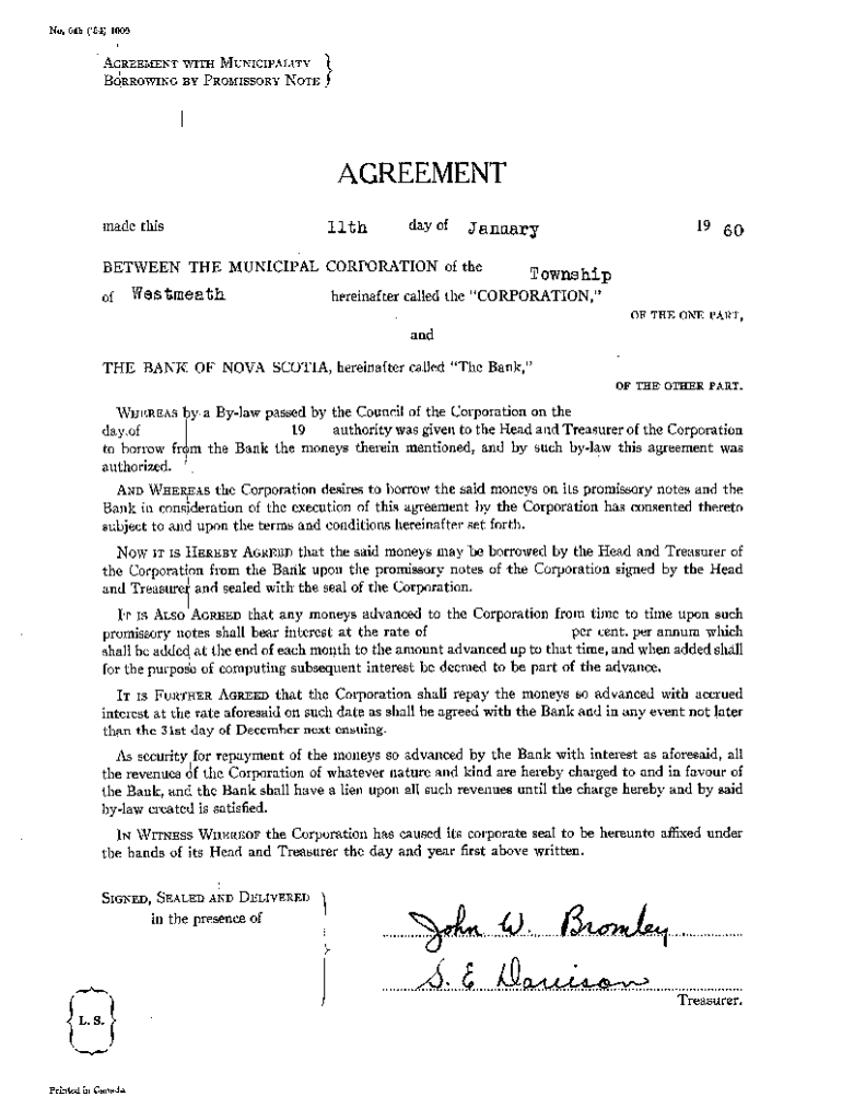 No. 54b (\'54× 1000. AGREEMENT WITH MUNICIPALITY BORROWING BY Promissory NoTEAGREEMENT made this11thday OFJ and. Between THE MUNICIPAL CORPORATION of the olives' tea th19 60Townshiphtreinafter called