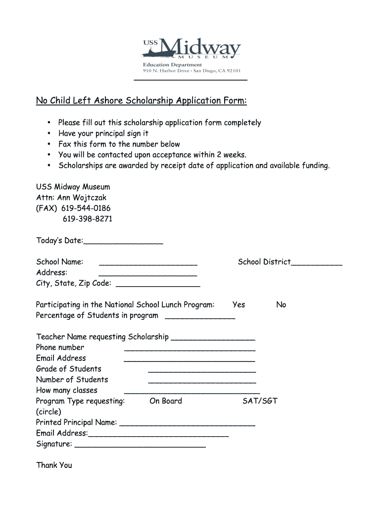 No Child Left Ashore Scholarship Application Form: Please fill out this scholarship application form completely. Have your principal sign it. Fax this form to ...