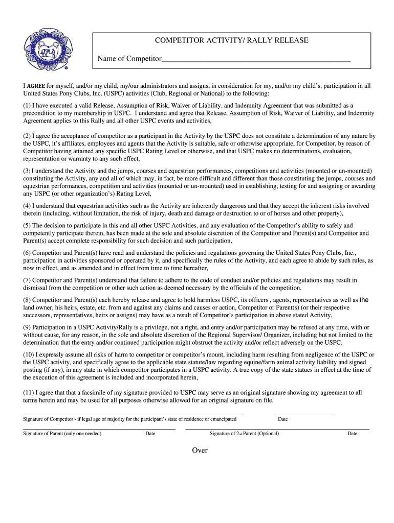 Participants in United States Pony Clubs activities, along with their parents or guardians, must complete this form to acknowledge and release the USPC from liability.