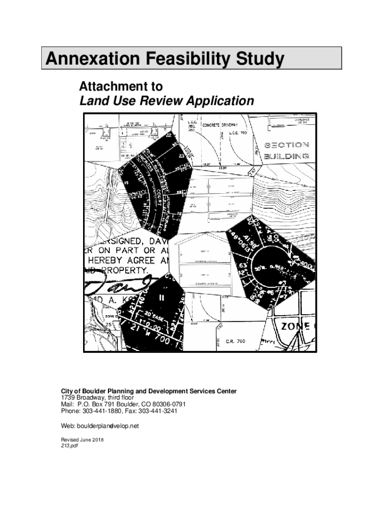 Annexation Feasibility Study Attachment to Land Use Review ApplicationCity of Boulder Planning and Development Services Center 1739 Broadway, third floor Mail: P.O. Box 791 Boulder, CO 803060791 Phone:
