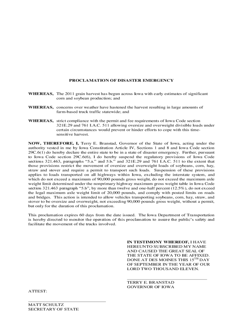 PROCLAMATION OF DISASTER EMERGENCYWHEREAS, The 2011 grain harvest has begun across Iowa with early estimates of significant corn and soybean production; and WHEREAS, concerns over weather have hastened