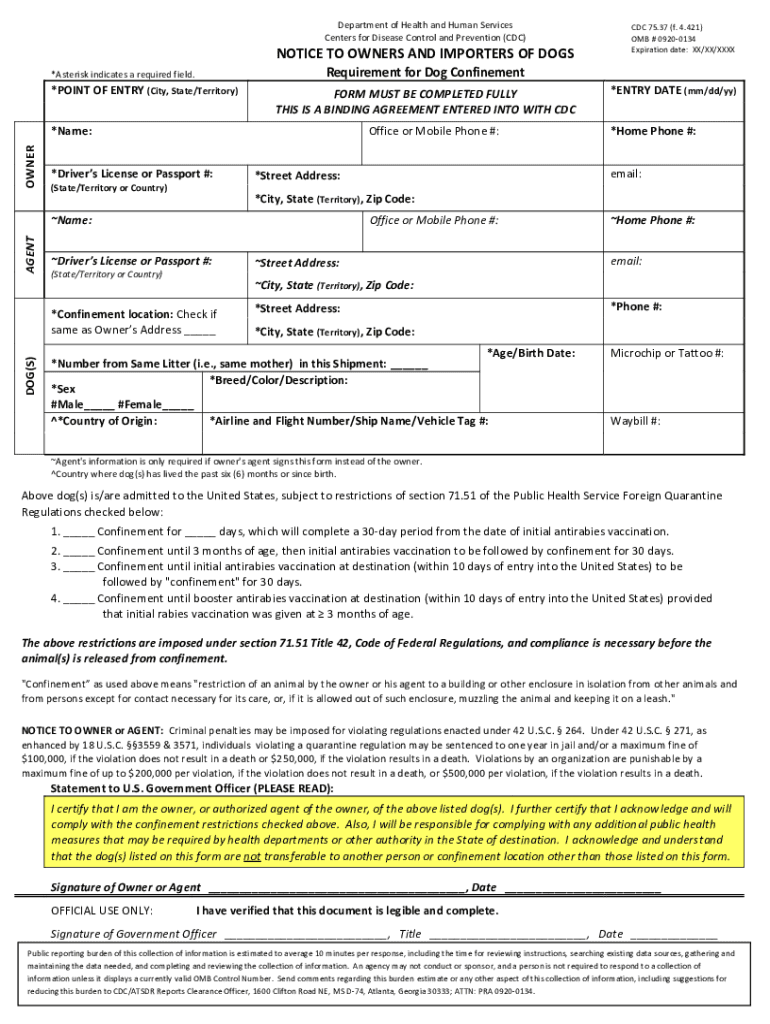 Department of Health and Human Services Centers for Disease Control and Prevention (CDC×NOTICE TO OWNERS AND IMPORTERS OF DOGS Requirement for Dog Confinement×Asterisk indicates a required field.×POINT