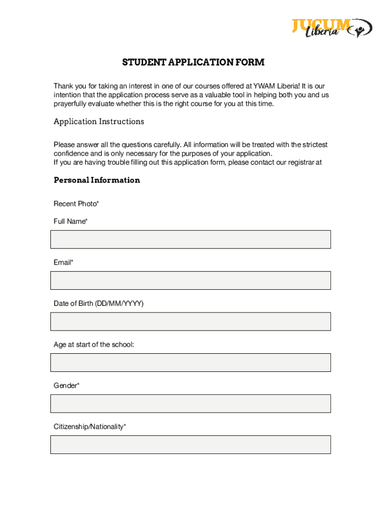 Get the free STUDENT APPLICATION FORM - Ywam Liberia