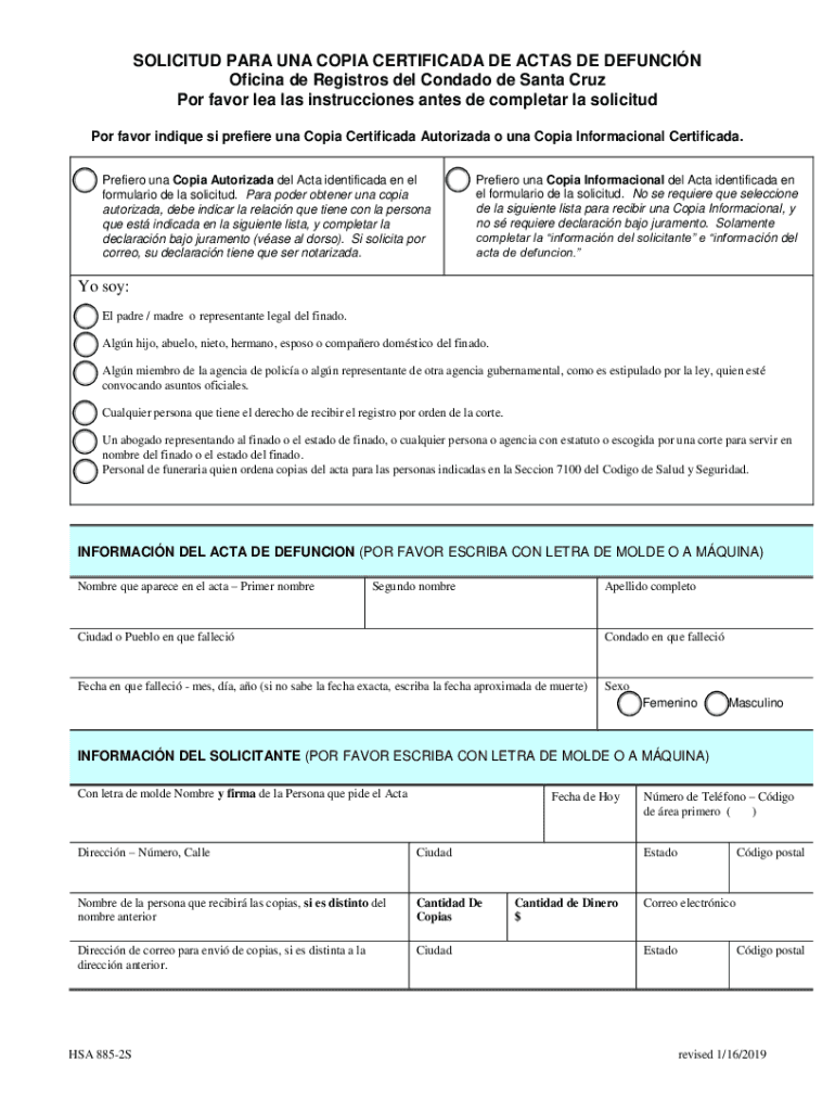 NECESSITY UN ACTA DE FUNCTION? Official de Registros del Condado de Santa CruzSOLICITUD PARA RNA COPRA CERTIFICATE DE ACTS DE DEFUNCT POR favor lea leis instructions antes DE completer la solicited.