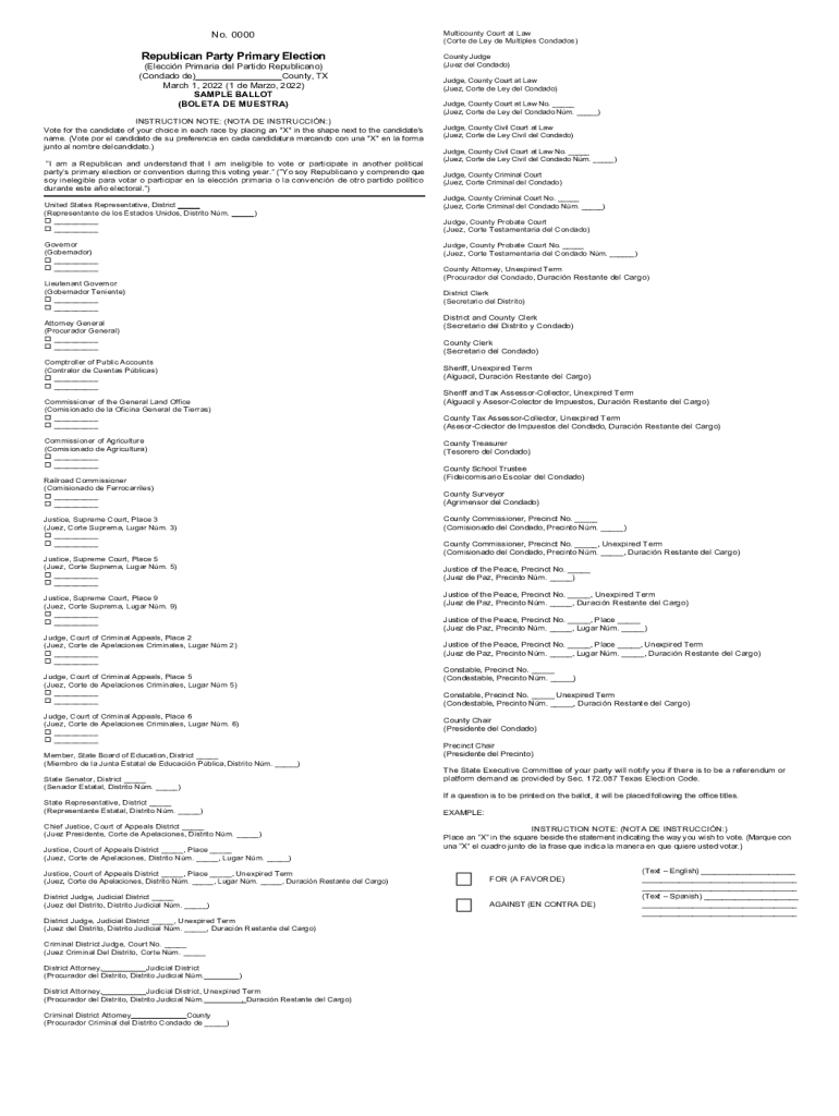 No. 0000Republican Party Primary Election×Election Prim aria Del Parties Republican) (Condado de) County, TX March 1, 2022 ×1 de Mario, 2022) SAMPLE BALLOT (BOLE TA DE MAESTRO) INSTRUCTION NOTE: