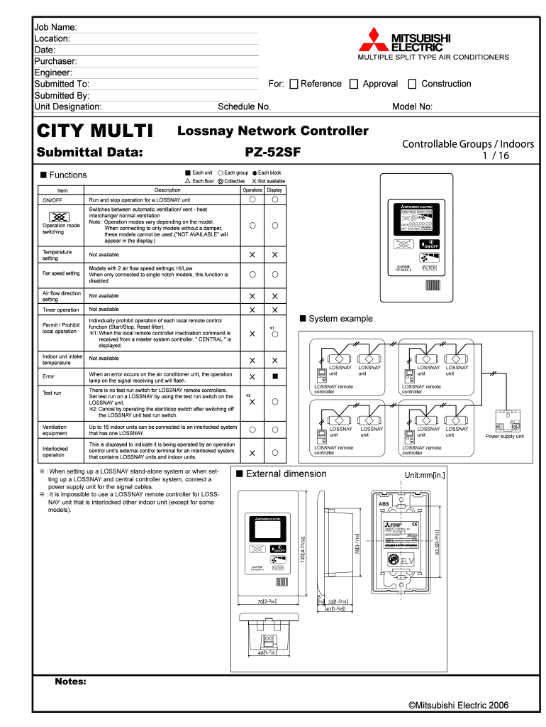 Job Name: Location: Date: Purchaser: Engineer: Submitted To: Submitted By: Unit Designation: CITY MULTI MULTIPLE SPLIT TYPE AIR CONDITIONERS For: Schedule No. Each unit :Each group :Each block :Each