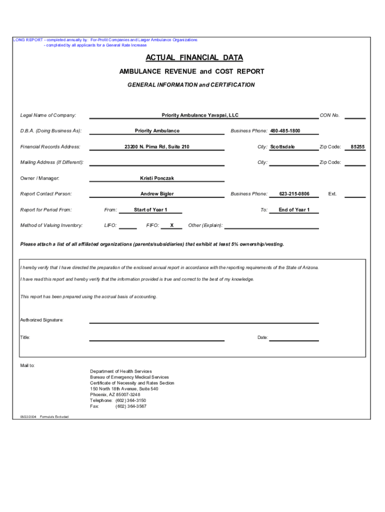 LONG REPORT completed annually by: For-profit Companies and Larger Ambulance Organizations completed by all applicants for a General Rate IncreaseACTUAL FINANCIAL DATA AMBULANCE REVENUE and COST REPORT