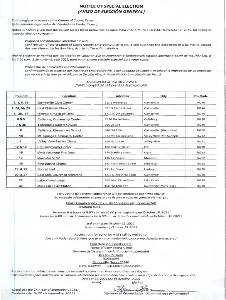 NOTICE OF SPECIAL ELECTION (AV×SO DE ELECT×ON GENERAL) To the registered voters of the County of Cooke, Texas : (a /OS rotates registrants DE/ Condado de Cooke, Texas :) Notice is hereby given that