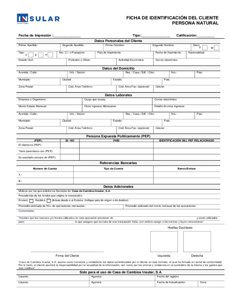 FICA DE IDENTIFICATION DEL CLIENT PERSONA NATURAL Tech de Impresin :___Tip:___Calcification:___Dates Personages Del Client Primer Adelaide:Segundo Adelaide:Tip:Primer Hombre:NRO. C.I. o Passport: