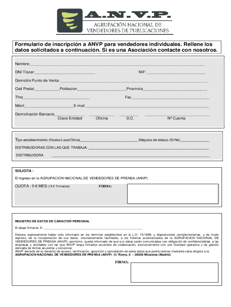 Get the free Formulario de inscripcin a ANVP para vendedores ...