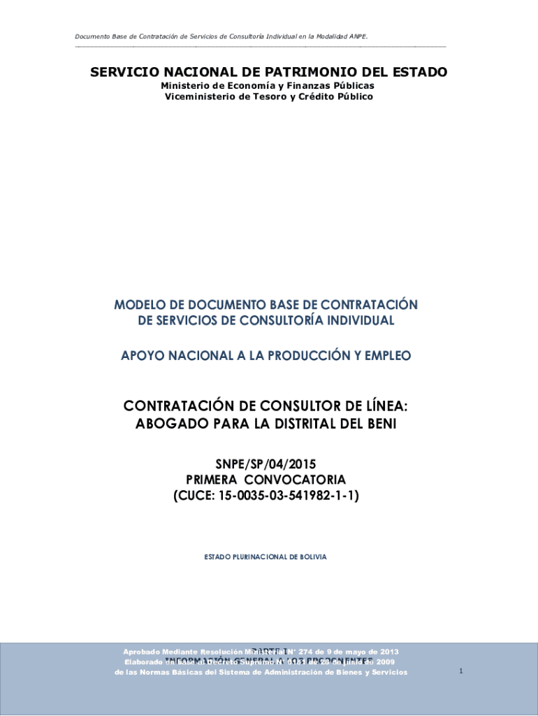 Document Base de Contratacin de Servicios de Consultora Individual en la Modality ANPE. ___SERVICE NATIONAL DE PATRIMONY DEL ESTATE Minister de Economa y Finances Pelican Viceministerio de Tesoro