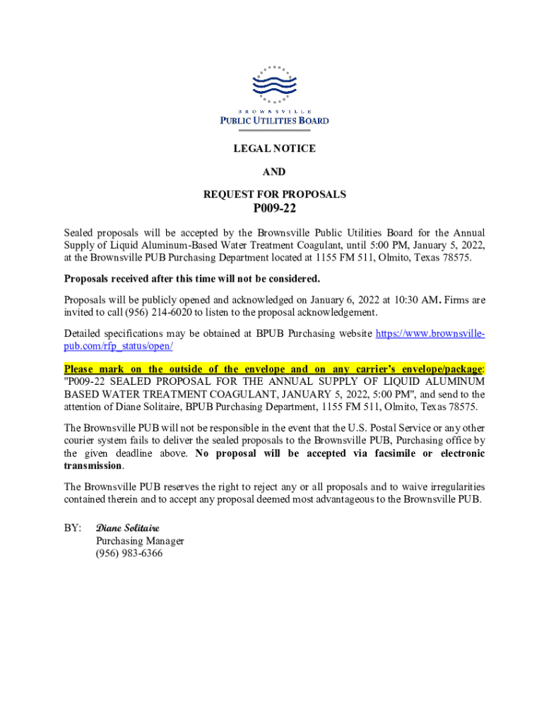 LEGAL NOTICE AND REQUEST FOR PROPOSALSP00922Sealed proposals will be accepted by the Brownsville Public Utilities Board for the Annual Supply of Liquid AluminumBased Water Treatment Coagulant, until