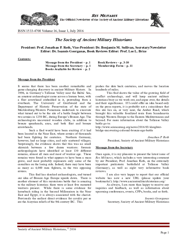 ISSN 15334708 Volume 16, Issue 1, July 2016The Society of Ancient Military Historians President: Prof. Jonathan P. Roth, VicePresident: Dr. Benjamin M. Sullivan, Secretary×Newsletter Editor: Dr.