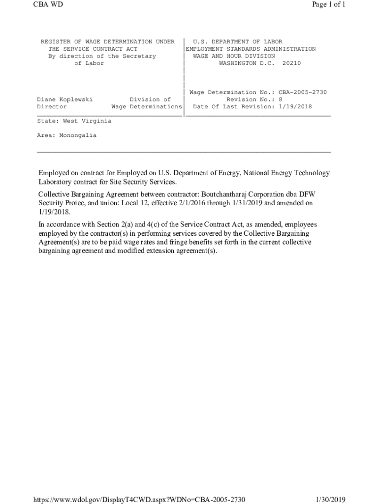 CBA WD Page 1 of 1REGISTER OF WAGE DETERMINATION UNDER THE SERVICE CONTRACT ACT By direction of the Secretary of Labor| U.S. DEPARTMENT OF LABOR |EMPLOYMENT STANDARDS ADMINISTRATION | WAGE AND HOUR