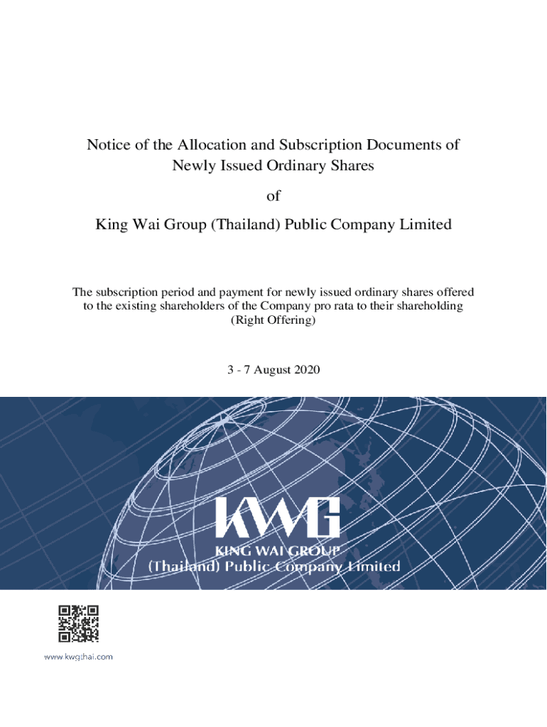 Notice of the Allocation and Subscription Documents of Newly Issued Ordinary Shares of King Was Group (Thailand) Public Company Limited subscription period and payment for newly issued ordinary shares