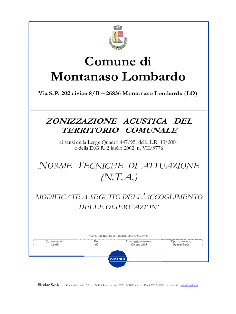 Commune di Montana so Lombardo Via S.P. 202 civic 8×B 26836 Montana so Lombardo (LO×ZONIZZAZIONE ACOUSTIC DEL TERRITORY COMMUNAL AI sense Della Legged Squadron 447×95, Della L.R. 13×2001 e Della