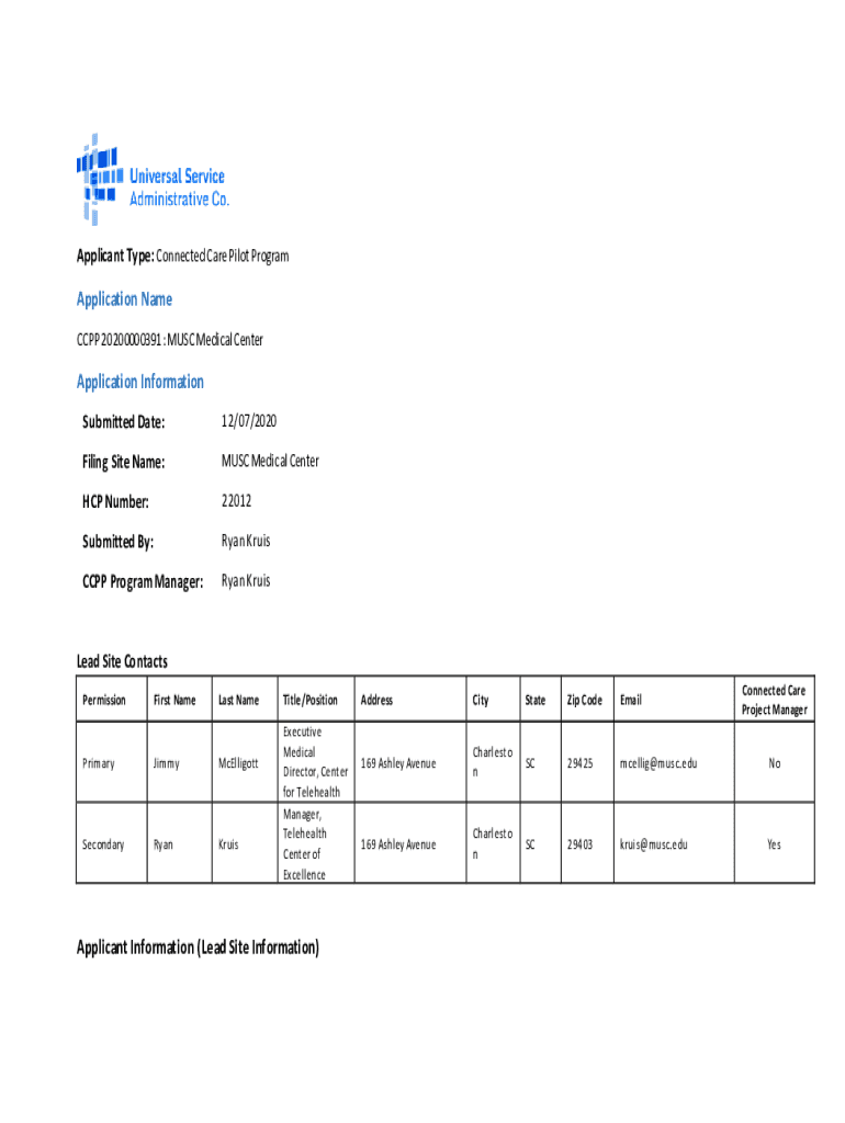 Applicant Type: Connected Care Pilot ProgramApplication Name CCPP20200000391 : MUST Medical CenterApplication Information Submitted Date:12×07/2020Filing Site Name:MUST Medical Center Number:22012Submitted
