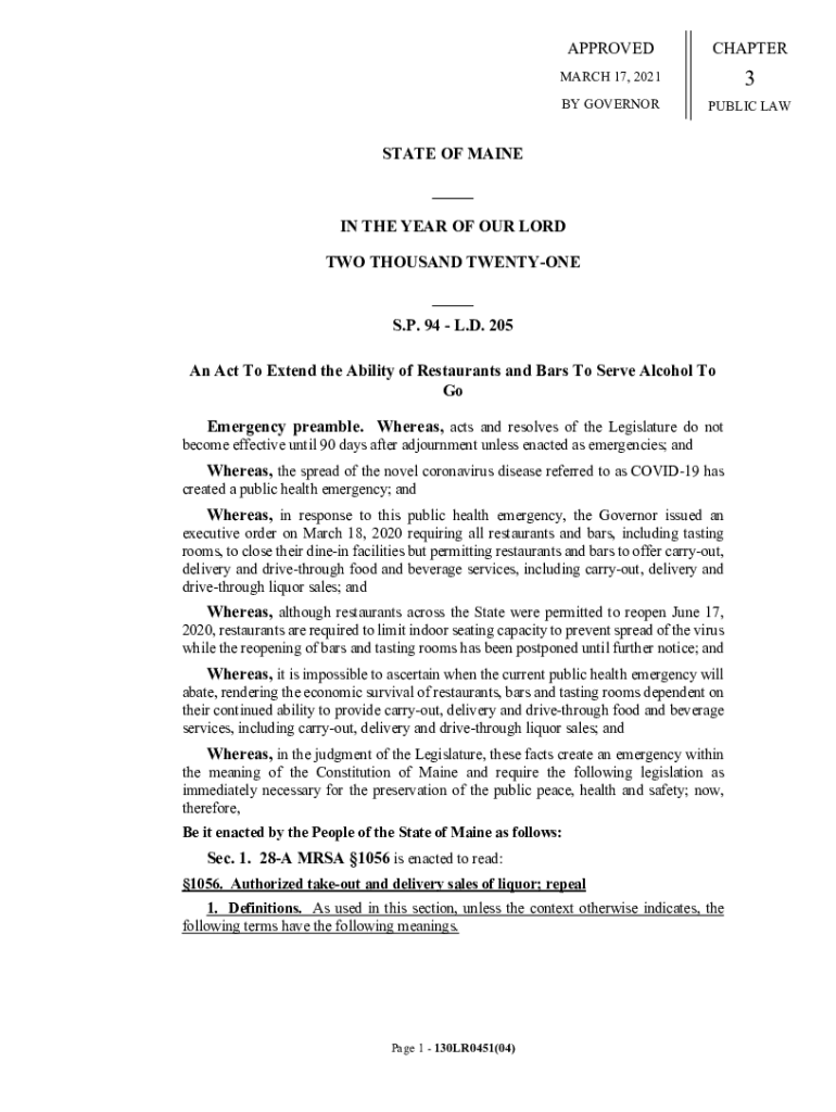 APPROVEDCHAPTERMARCH 17, 20213BY GOVERNORPUBLIC LACTATE OF MAINE ___ IN THE YEAR OF OUR LORD TWO THOUSAND TWENTY ONE ___ S.P. 94 L.D. 205 An Act To Extend the Ability of Restaurants and Bars To Serve