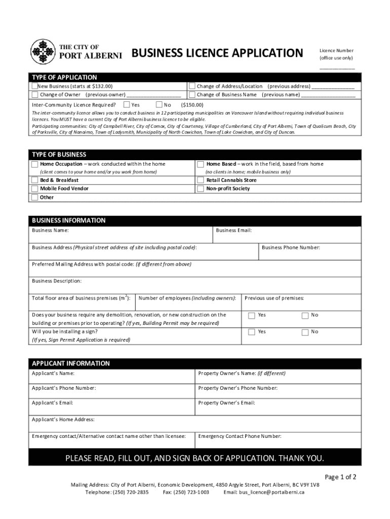 BUSINESS License APPLICATION CITY REPORT ALBERNILicence Number (office use only)___TYPE OF APPLICATION New Business (starts at $132.00) Change of Owner (previous owner) ___ Intercommunicate License